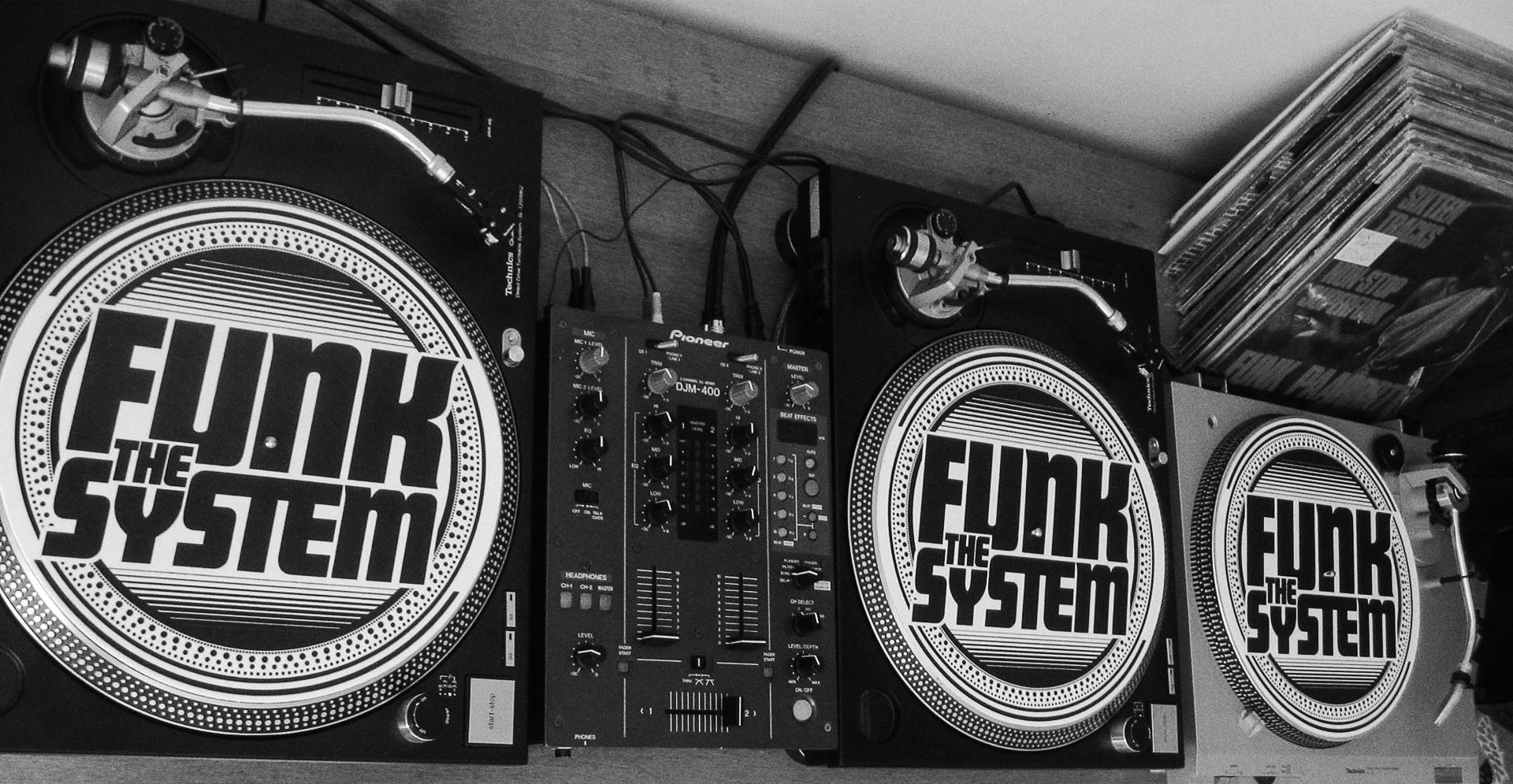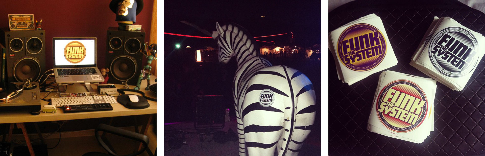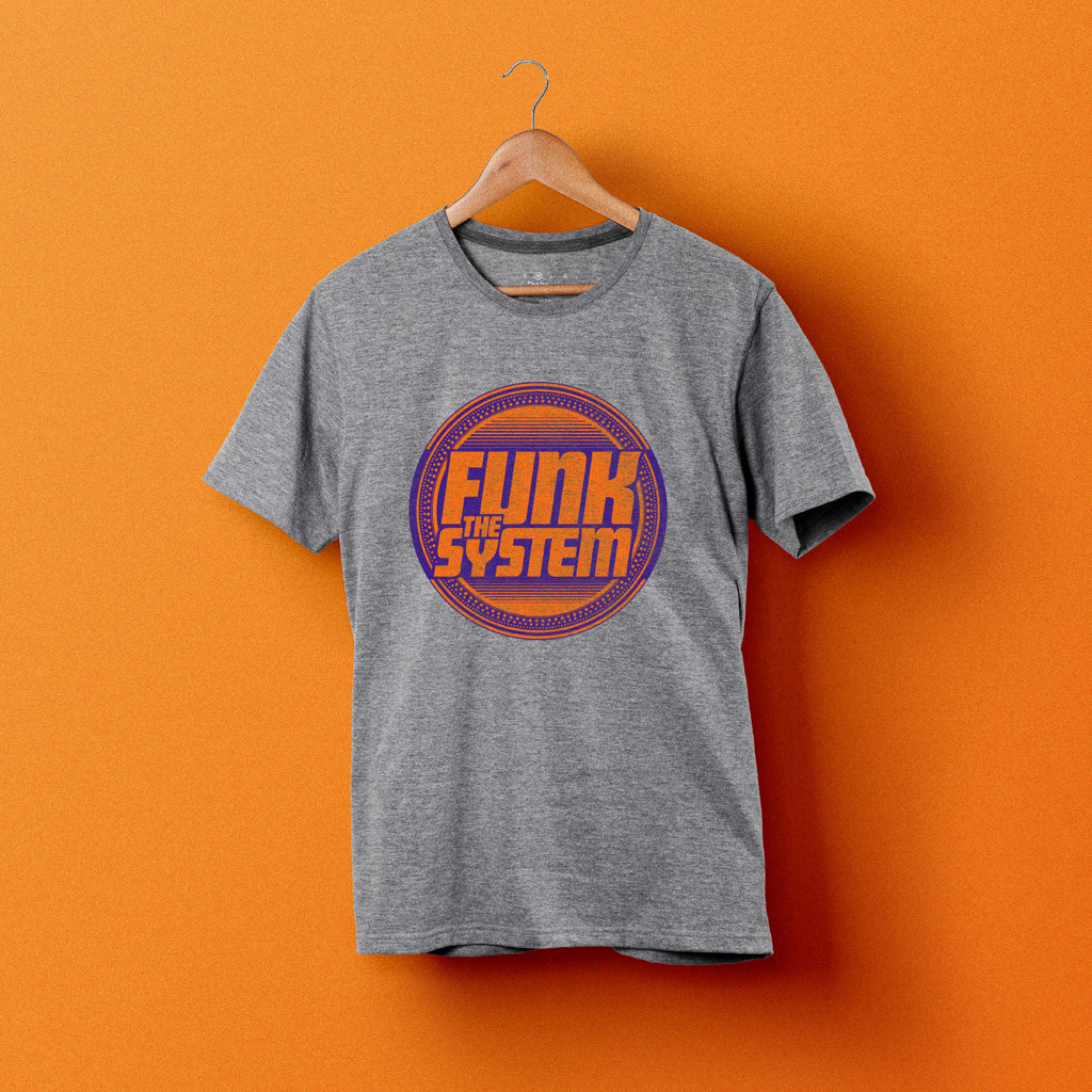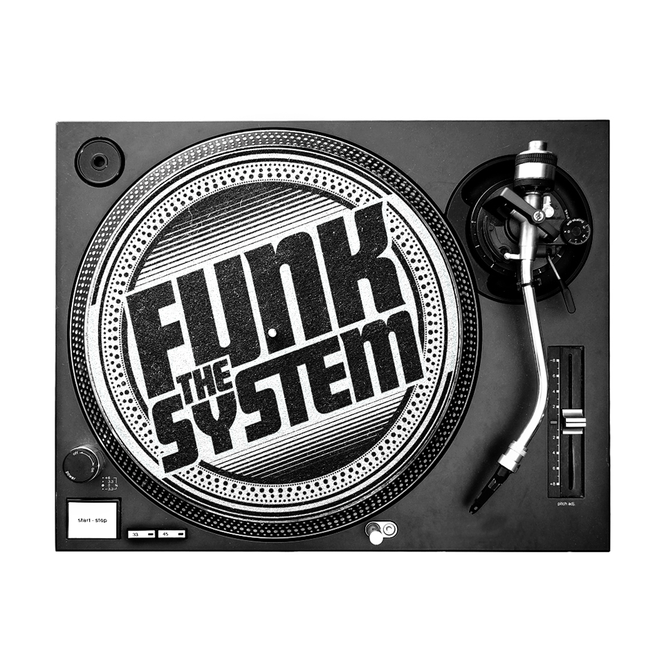 Funk the System é um trio de DJs de Brasília. Eles encomendaram uma marca que lembrasse hip hop old school, turntables de vinil e que ficasse bom em um formato de sticker, para colarem em todos os lugares que fossem tocar. Criamos a marca com todas essas nuances e infinitas variações de cor, para diversos tipos de impressão. Eles fizeram não só os adesivos, mas também feltro para proteção das vitrolas, camisetas, flyers e capas de EP.